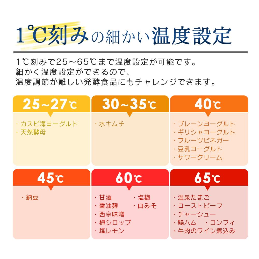 ヨーグルトの種類や発酵食品に合わせて温度と時間を設定できます。